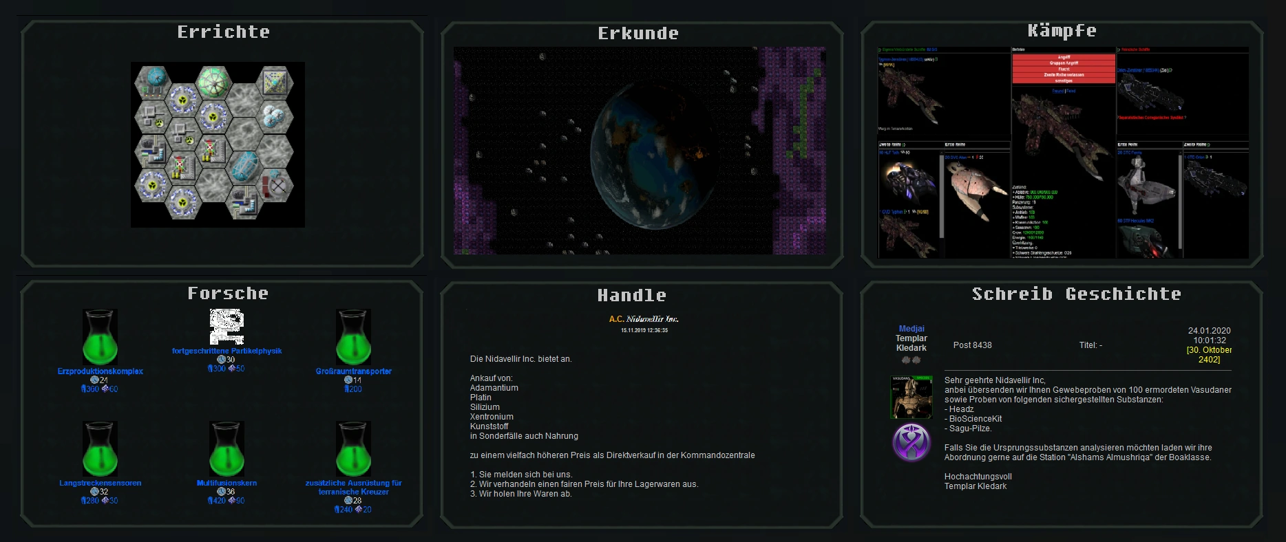 About Drifting Souls 2DRIFTING SOULS 2 - Vorstellung eines Browserspiels Review of a German YouTuber Mister Moerp Drifting Souls 2 (DS2) is a complex building strategy game set in space and taking place in the future. The historical role-playing background of the game is the 90s computer games of the Freespace series. DS2 is completely free and all you need to play it is a browser and an active Internet connection. In DS2 you start on a barren asteroid, which you first have to develop and expand. In this part, DS2 resembles the well-known building strategy games like OGame, Tribes and Ikariam. But this is only a small part. In DS2 you can fly your ships over 2D star maps, equip them manually, control them individually and fight with them. You can join alliances and factions, trade and explore space. Whether you are a trader, a warrior, a hermit or a team player, whether you have a lot of time or not much: a player of any play style will feel at home. A special treat is also the writing role-playing game integrated into the game. Players can role-play in the so-called Com-Net, a universe-wide communication network. From a simple emergency call to an elaborate RPG episode, there is room for everyone who wants to let off steam creatively. DS2 is programmed by volunteer developers since 2001. To this day, regular updates freshen up the game. Moreover, there are no boring, predictable NPC AIs, because the NPCs are controlled and managed by humans. Get in your spaceship now and become a Vasudan pirate, Terran extremist, generous trader, pacifist communist or spiritual fundamentalist. Go here to play: https://ds2.drifting-souls.net/ |